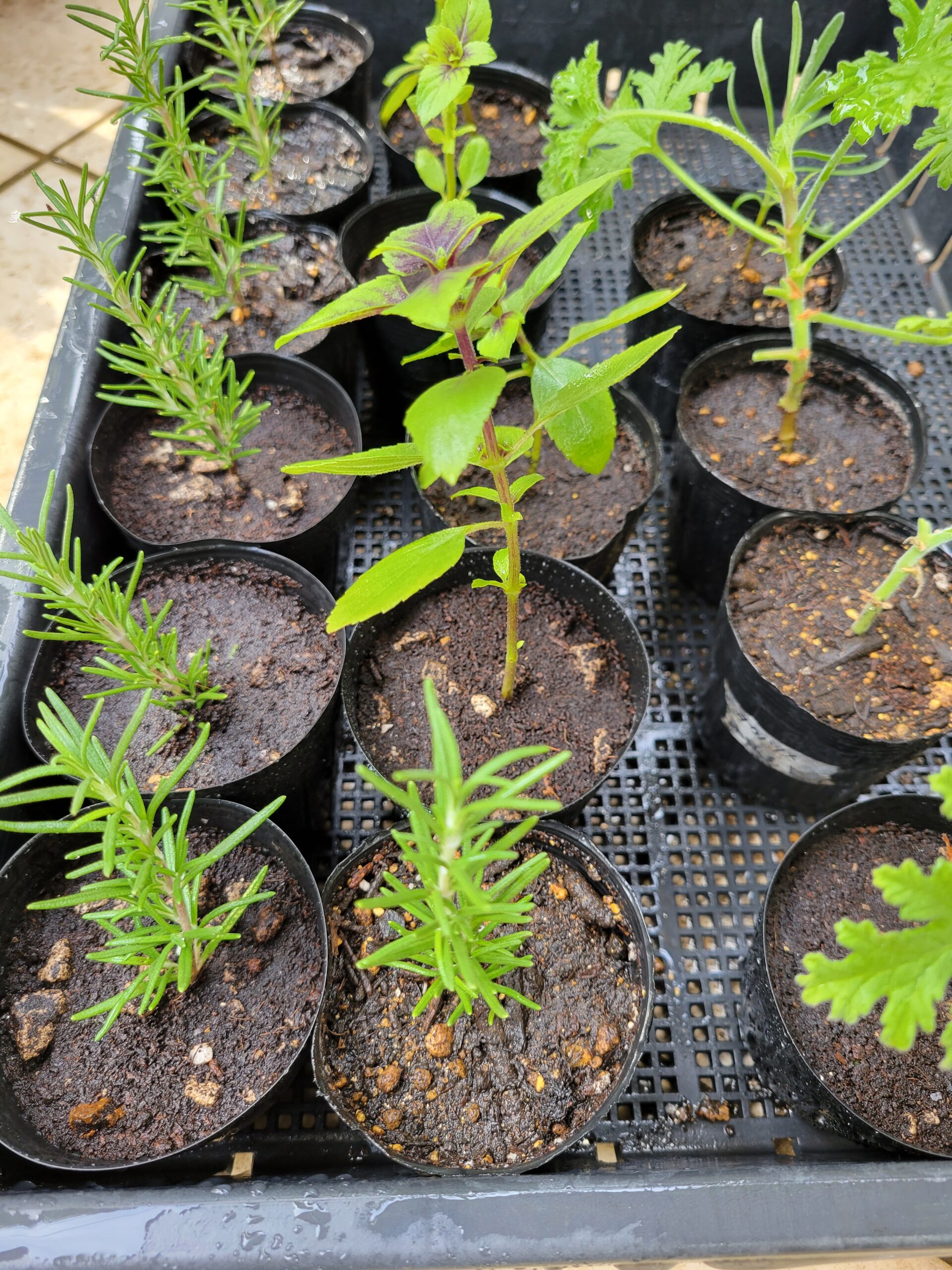 そして万が一に備え、挿し木で増やすことができる品種は保険用に挿し木をしておきます。耐寒性があるハーブも挿し木しておきます。10月から少しずつ進めていて、ラベンダー、ローズマリー、ローズゼラニウム、セージ、レモンバーム、レモンバーベナ、アフリカンブルーバジル、マシュ・マロウなど挿し木しています。今年はJHS(Japan Herb Sience)のハイビスカスも挿し木させてもらいビニール温室に入れて発根を待っているところです。今回挿し木には、赤玉土と鹿沼土、パーライトを混ぜた土を使いました。