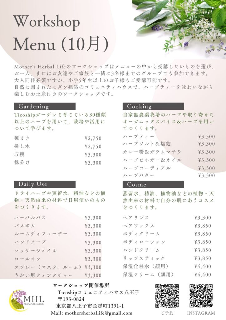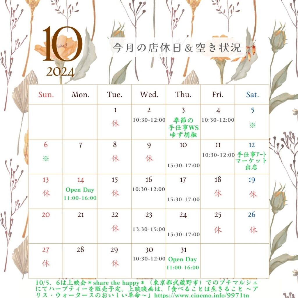 今回は、10月のワークショップメニューと営業予定のご案内です。