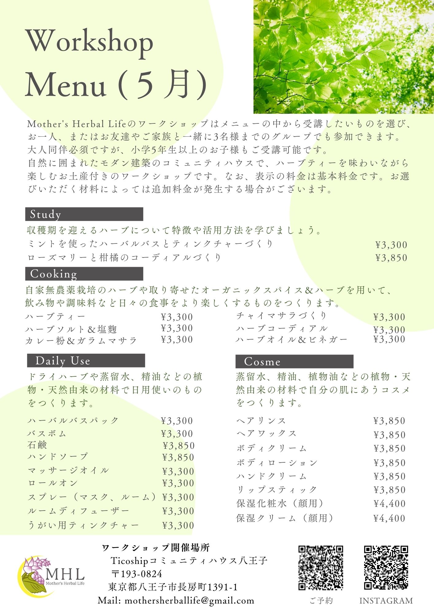 また、原材料が全体的に値上がりしていることもあり、表示金額は基本料金とさせていただき、一部のドライハーブと精油については、使用量によっては追加料金が発生する場合がございます。当該材料については、ワークショップの際に価格リストを提示し、お客様に使うかどうかをご判断いただくようにしています。